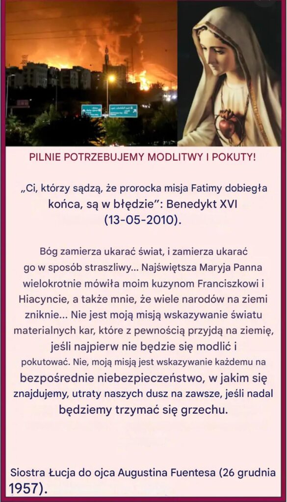 Z pewnością to proroctwo nie odnosiło się do II wojny światowej, ale do późniejszych wydarzeń. PILNIE POTRZEBUJEMY MODLITWY I POKUTY! „Ci, którzy sądzą, że prorocka misja Fatimy dobiegła końca, są w błędzie”: Benedykt XVI (13-05-2010). s. Łucja wizjonerka z Fatimy – ” Bóg zamierza ukarać świat, i zamierza ukarać go w sposób straszliwy… Najświętsza Maryja Panna wielokrotnie mówiła moim kuzynom Franciszkowi i Hiacyncie, a także mnie, że wiele narodów na ziemi zniknie… Nie jest moją misją wskazywanie światu materialnych kar, które z pewnością przyjdą na ziemię, jeśli najpierw nie będzie się modlić i pokutować. Nie, moją misją jest wskazywanie każdemu na bezpośrednie niebezpieczeństwo, w jakim się znajdujemy, utraty naszych dusz na zawsze, jeśli nadal będziemy trzymać się grzechu. Siostra Łucja do ojca Augustina Fuentesa (26 grudnia 1957). / źródło post z 22.06.2025 kanału na youtubie Conservando la Fe @ConservandolaFe
