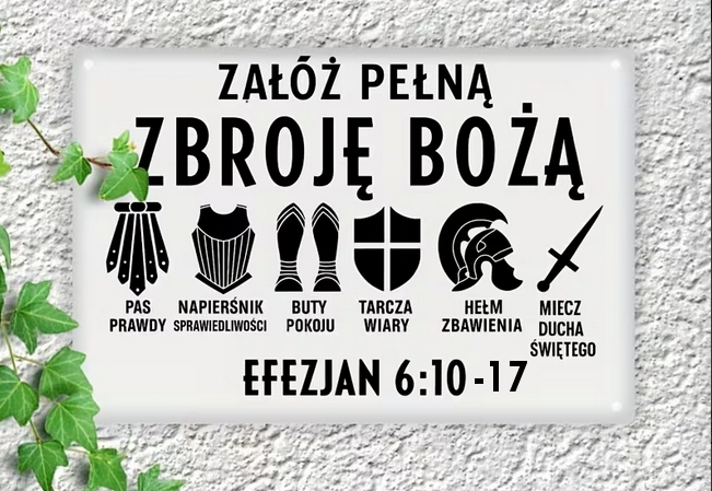 10 W końcu bądźcie mocni w Panu – siłą Jego potęgi. 11 Obleczcie pełną zbroję Bożą, byście mogli się ostać wobec podstępnych zakusów diabła. 12 Nie toczymy bowiem walki przeciw krwi i ciału, lecz przeciw Zwierzchnościom, przeciw Władzom, przeciw rządcom świata tych ciemności, przeciw pierwiastkom duchowym zła na wyżynach niebieskich. 13 Dlatego weźcie na siebie pełną zbroję Bożą, abyście w dzień zły zdołali się przeciwstawić i ostać, zwalczywszy wszystko. 14 Stańcie więc [do walki] przepasawszy biodra wasze prawdą i oblókłszy pancerz, którym jest sprawiedliwość, 15 a obuwszy nogi w gotowość [głoszenia] dobrej nowiny o pokoju. 16 W każdym położeniu bierzcie wiarę jako tarczę, dzięki której zdołacie zgasić wszystkie rozżarzone pociski Złego. 17 Weźcie też hełm zbawienia i miecz Ducha, to jest słowo Boże- 18 wśród wszelakiej modlitwy i błagania. Przy każdej sposobności módlcie się w Duchu! Nad tym właśnie czuwajcie z całą usilnością i proście za wszystkich świętych 19 i za mnie, aby dane mi było słowo, gdy usta moje otworzę, dla jawnego i swobodnego głoszenia tajemnicy Ewangelii, 20 dla której sprawuję poselstwo jako więzień, ażebym jawnie ją wypowiedział, tak jak winienem. / List do Efezjan 6, 10- 20 /
